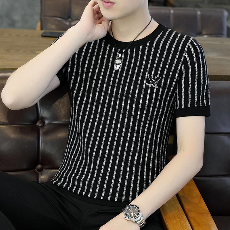 2024新型ストライプ半袖tシャツ男性夏の良い品質カジュアル薄いタイプの氷糸通気涼しいハイエンドt血