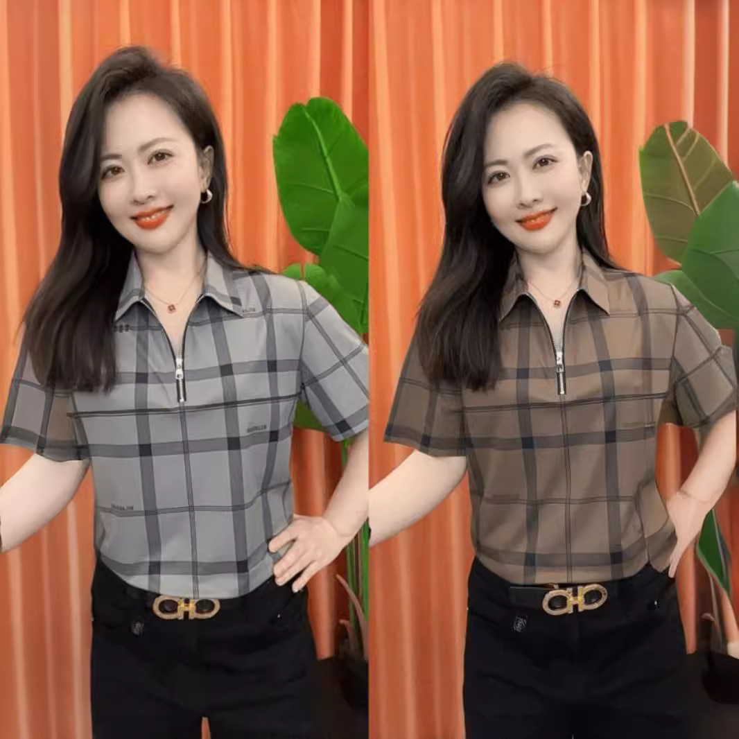 2025 ファッショントレンドメンズ夏カジュアルオールマッチ痩身クラシックチェック柄ハーフジップシャツ半袖トップ