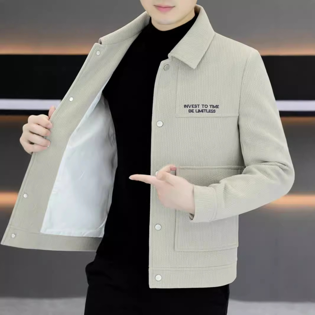 秋の冬の2024の新型の毛のコートの男性のファッションのハイエンドのカジュアルなジャケットは襟の短い金のラシャのコートの男性をひっくり返します。