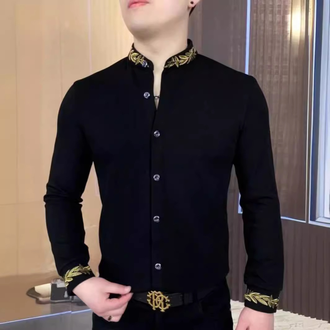 長袖のシャツの男性の春秋の新型のファッションのブランドのカジュアルな黒色の刺繍のガーディアンのごろつきの帥の中国風の立襟の上着