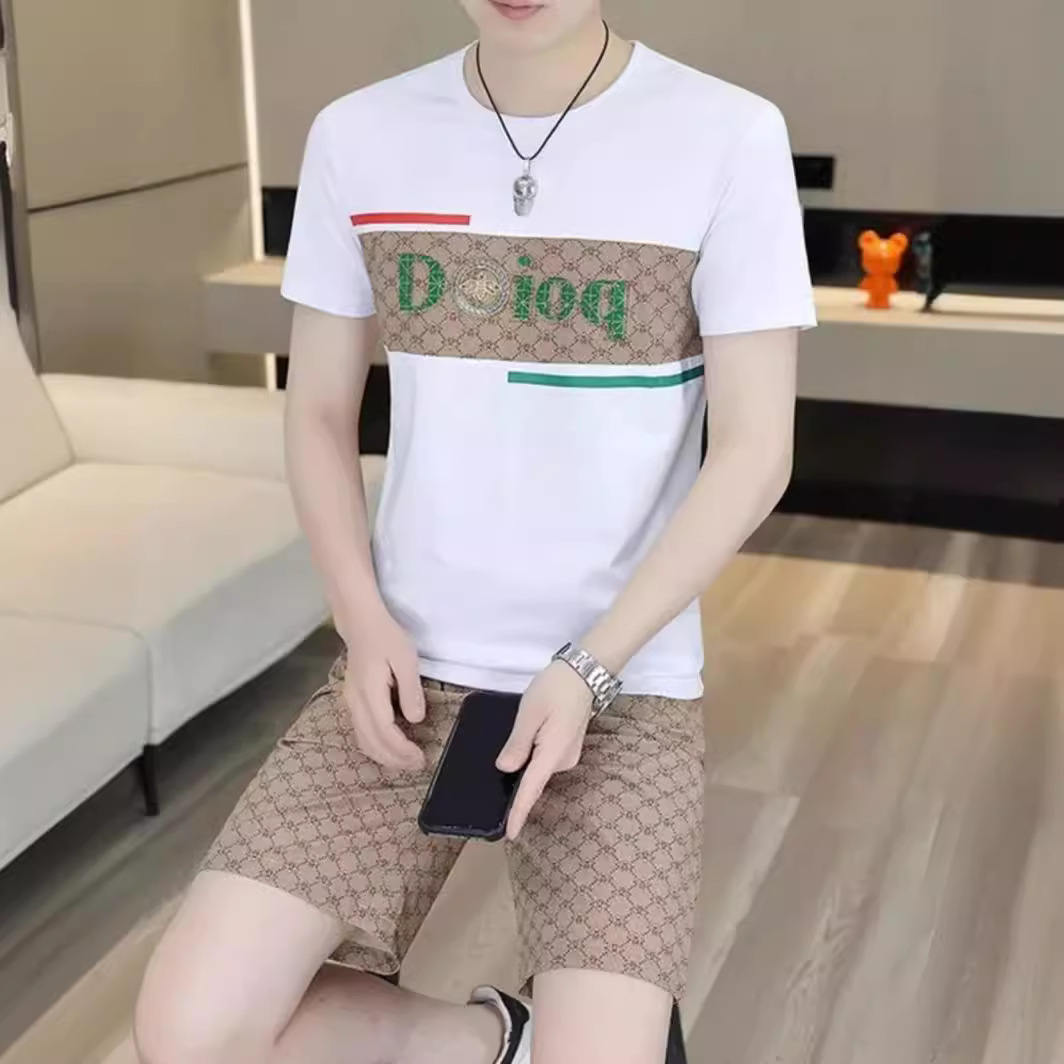 2024夏の新型スーツ男性カジュアルファッション薄手プリントショートパンツ氷糸男性tシャツ半袖2点セット