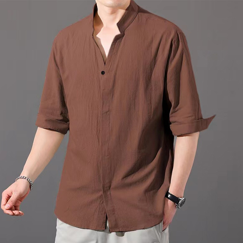 メンズvネック長袖シャツ2024新作夏綿麻シャツメンズカジュアル中国風立ち襟寸シャツ男
