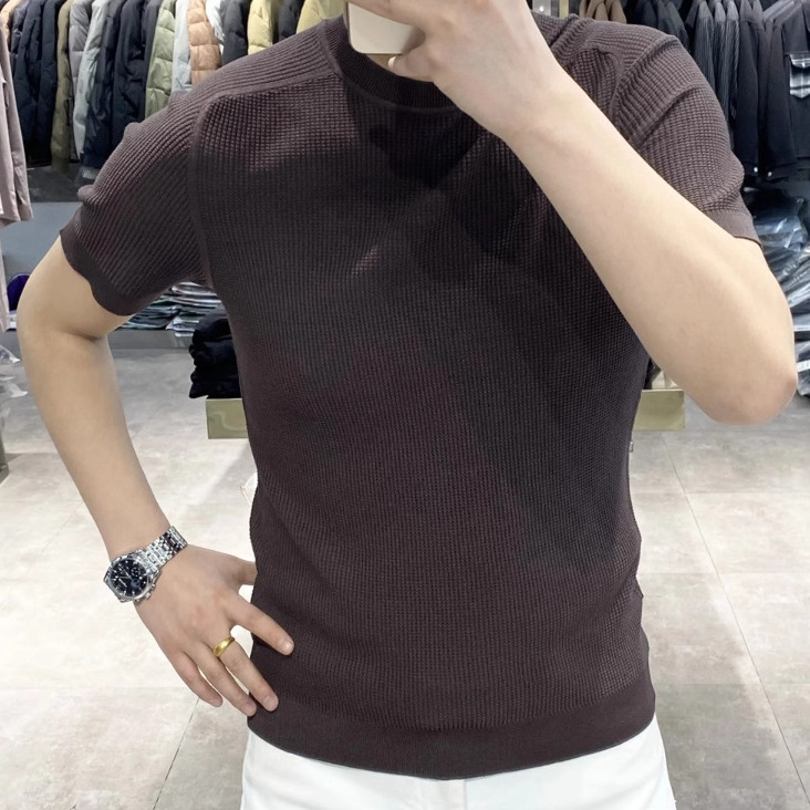 服装の潮流2024新型男性の純色は軽くて贅沢でシンプルです。パイナップルの花柄の丸首のニット半袖tシャツです。