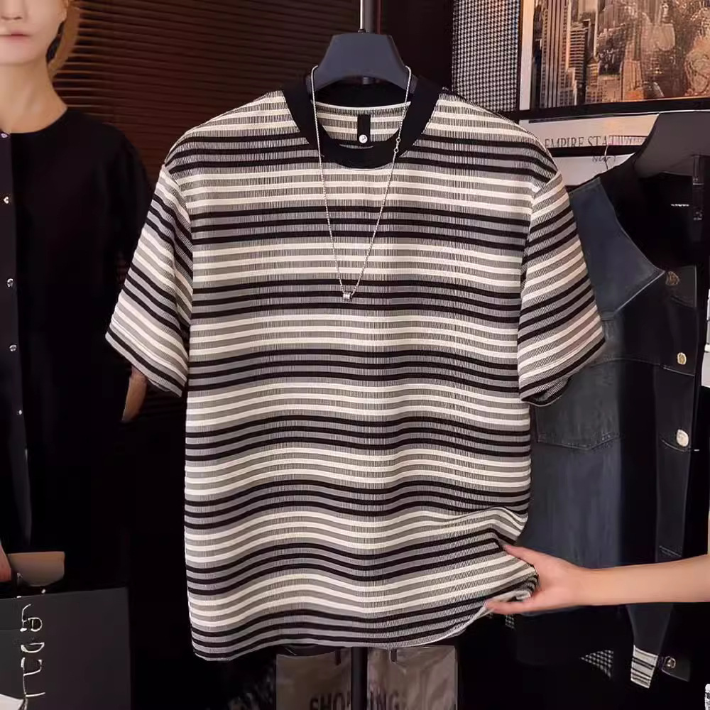 夏のストライプ半袖メンズtシャツ丸首軽豪華百合半袖男性ファッションゆるいカジュアルtシャツ