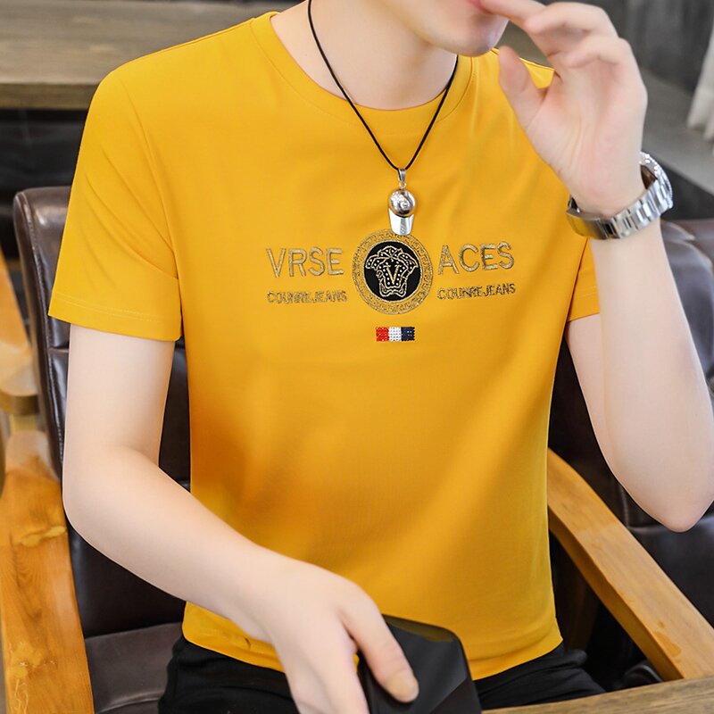 トレンディなヨーロッパブランドのアイスシルクコットンメンズ半袖Tシャツ2024夏ハイエンド刺繍薄手黄色Tシャツトップ