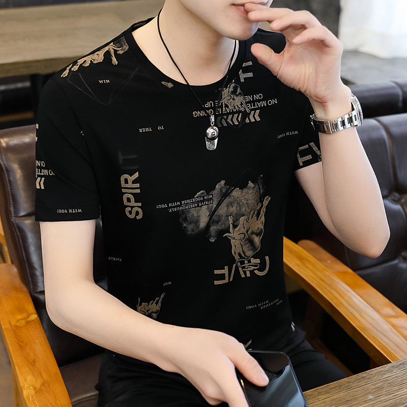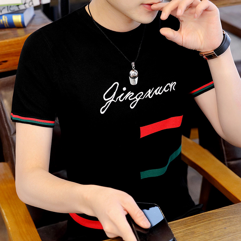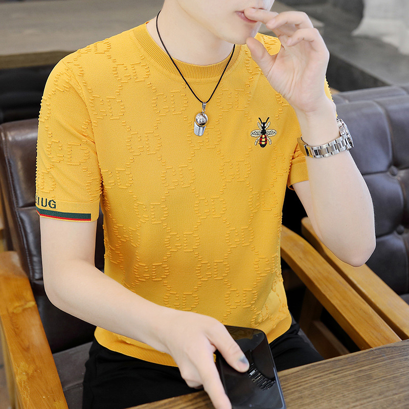夏の新型個性氷糸半袖tシャツ男性韓国版ニット半袖学生刺繍氷麻tシャツ上着