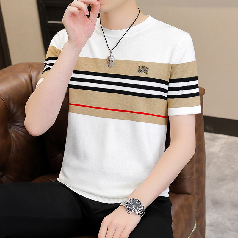 夏の半袖tシャツの男性の新型の修身ストライプの半袖のメリヤスの青年は薄いタイプの丸首の底のシャツを合わせます。