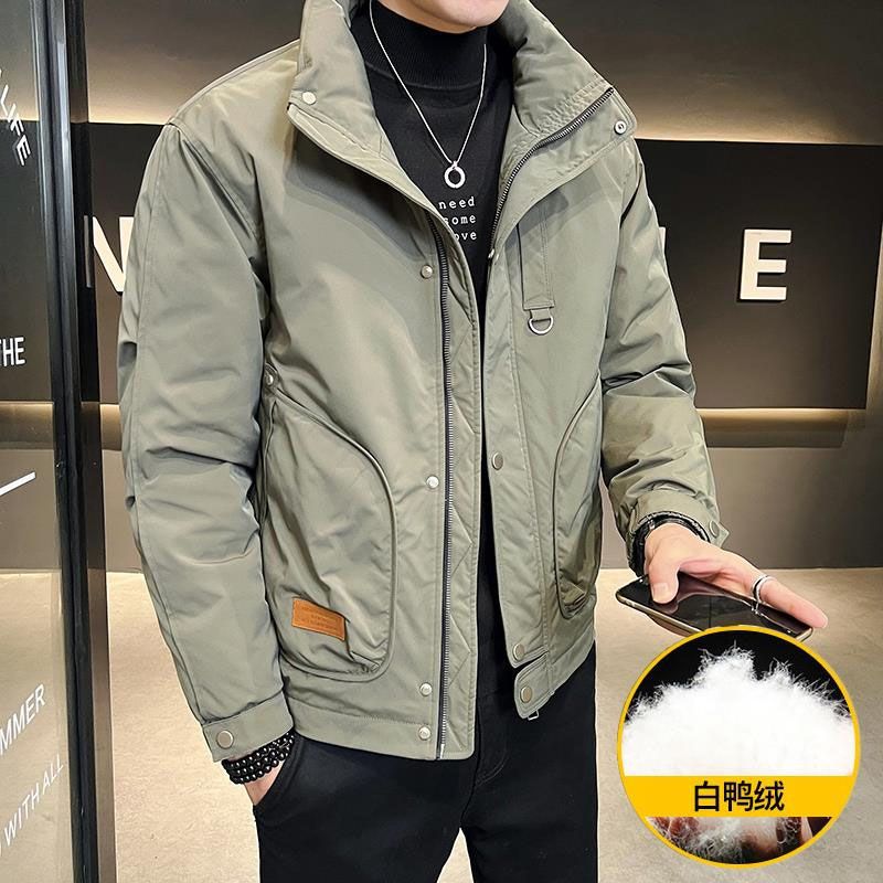 高級男性冬立襟ダウンジャケット青年カジュアルデザイン感が厚く、純色の工装保温白鴨パイル
