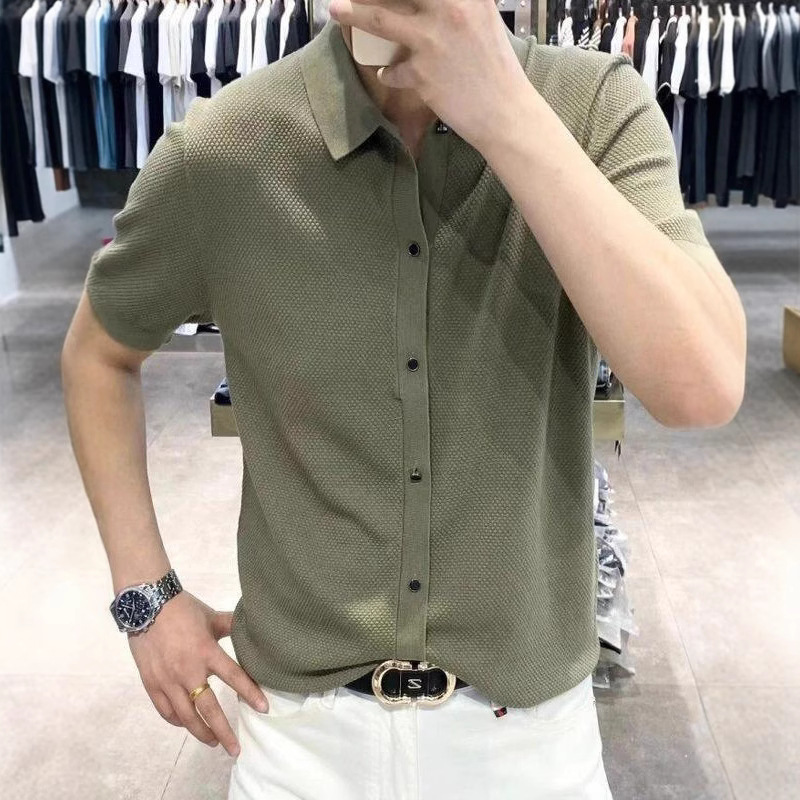 2025夏の修身ファッションカジュアルビジネスの贅沢な組み合わせの高品質の純色の襟のニットの半袖の薄いタイプはかっこいいです。