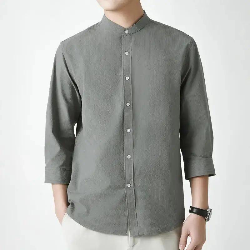 2025 メンズソリッドカラーファイバー七分袖シャツカジュアルルーズ中国風スタンドカラーシャツ若者と中年向け