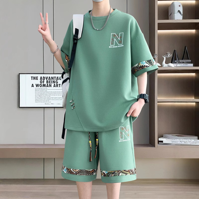 2025年夏新型中国風ファッションカジュアル男性スーツ丸首半袖tシャツ半ズボン2点セット潮