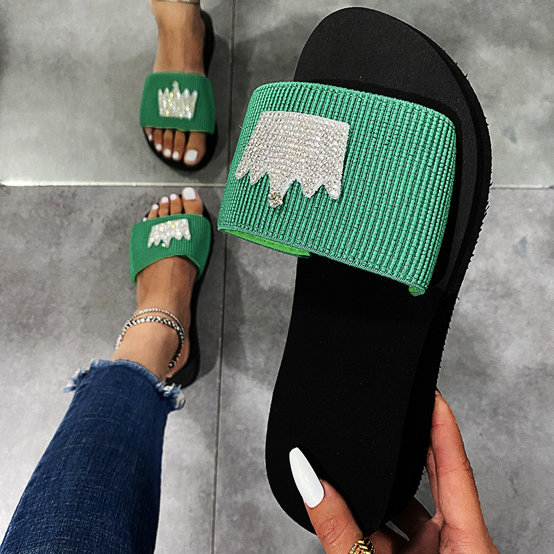 スリッパの女性2022夏の新型ネット赤キャンディーの個性的な水ドリルの平の王冠の外は厚い底の1字の冷たいスリッパを着ます。