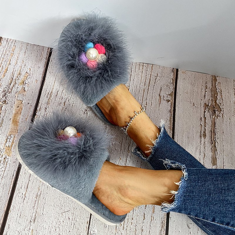 毛のスリッパの女性はネットの赤い2021の新型の秋冬の真珠の花の毛を着てかわいい毛の綿のスリッパを引っ張ります。