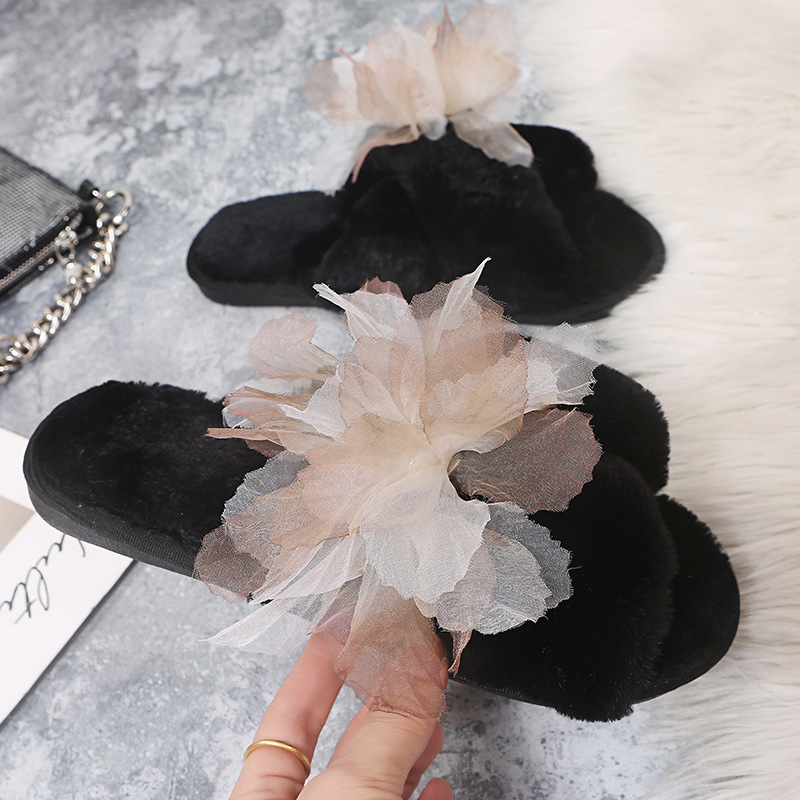 毛のスリッパの女性の冬の家の室内外の新型の韓国版の花の甘い保温の家庭の床の平の綿のスリッパ
