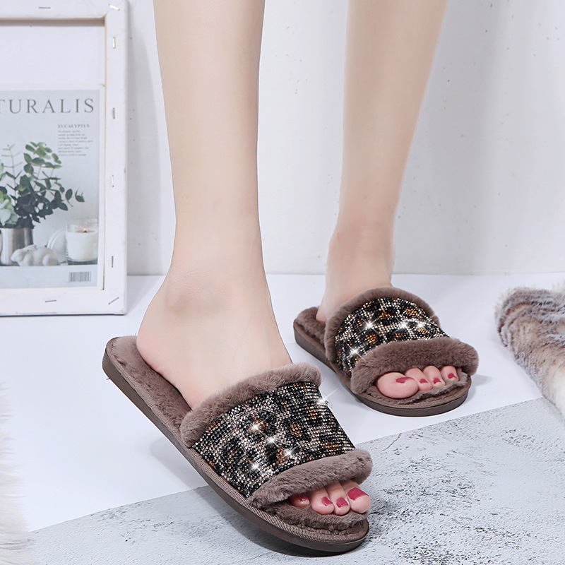 豹紋クロス毛羽立ちスリッパ女性秋冬居家平底口綿は欧米の越境保温床を引きずっています。