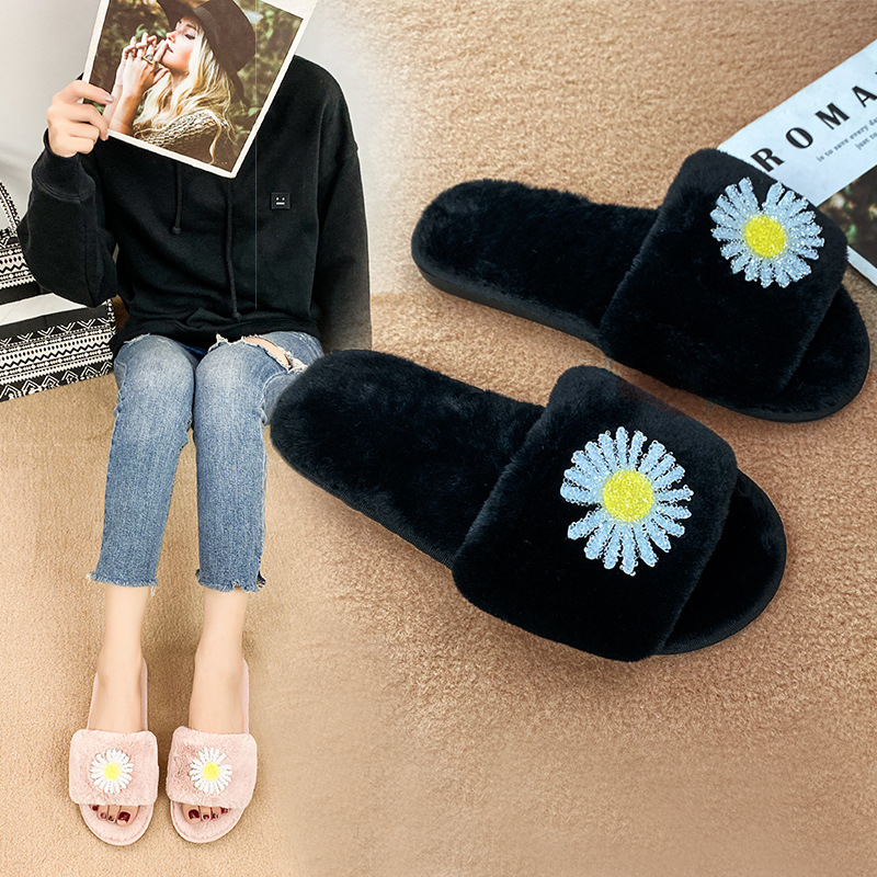 冬の日系小鄒菊プリントカップルスリッパ室内床保温ホームシューズ月子模造兎パイルスリッパ