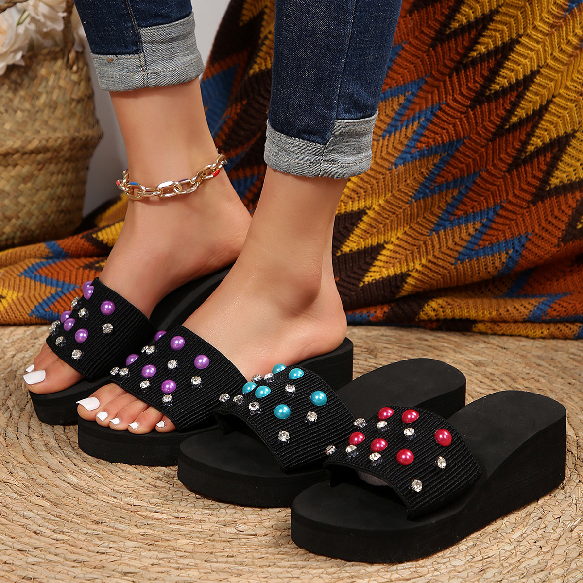クロスボーダー2024外国貿易の新型夏の坂と丸い頭の外に松餅の厚い底のドリルの真珠の一字式の冷たいスリッパを着ます。