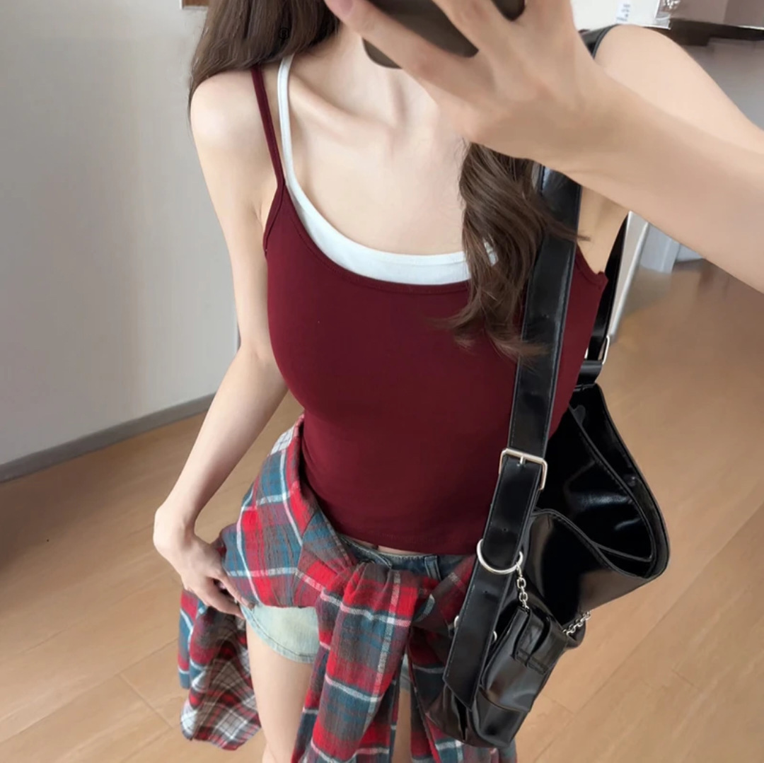 2025年の新しい夏のフェイクツーピースの小さなサスペンダーベルト、胸パッド付き、スリムフィット、美しいバックインナートップ、女性が甘くてスパイシーなスタイルで着用できます。