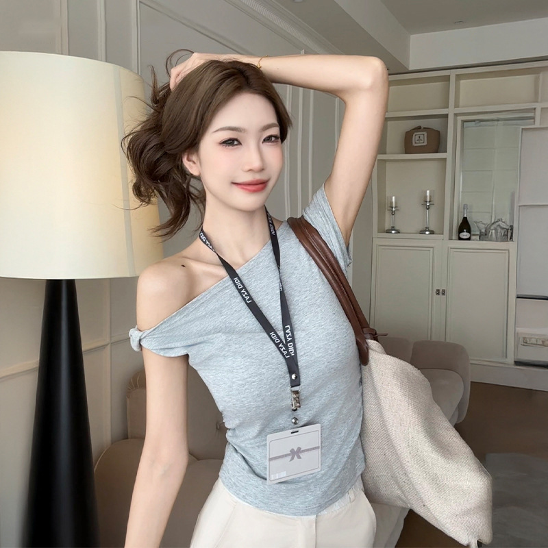 ホットガールワンラインネックTシャツ不規則な斜め肩ツイスト半袖夏純粋な欲望の女性のTシャツ甘くてスパイシーなスタイルのショートトップ