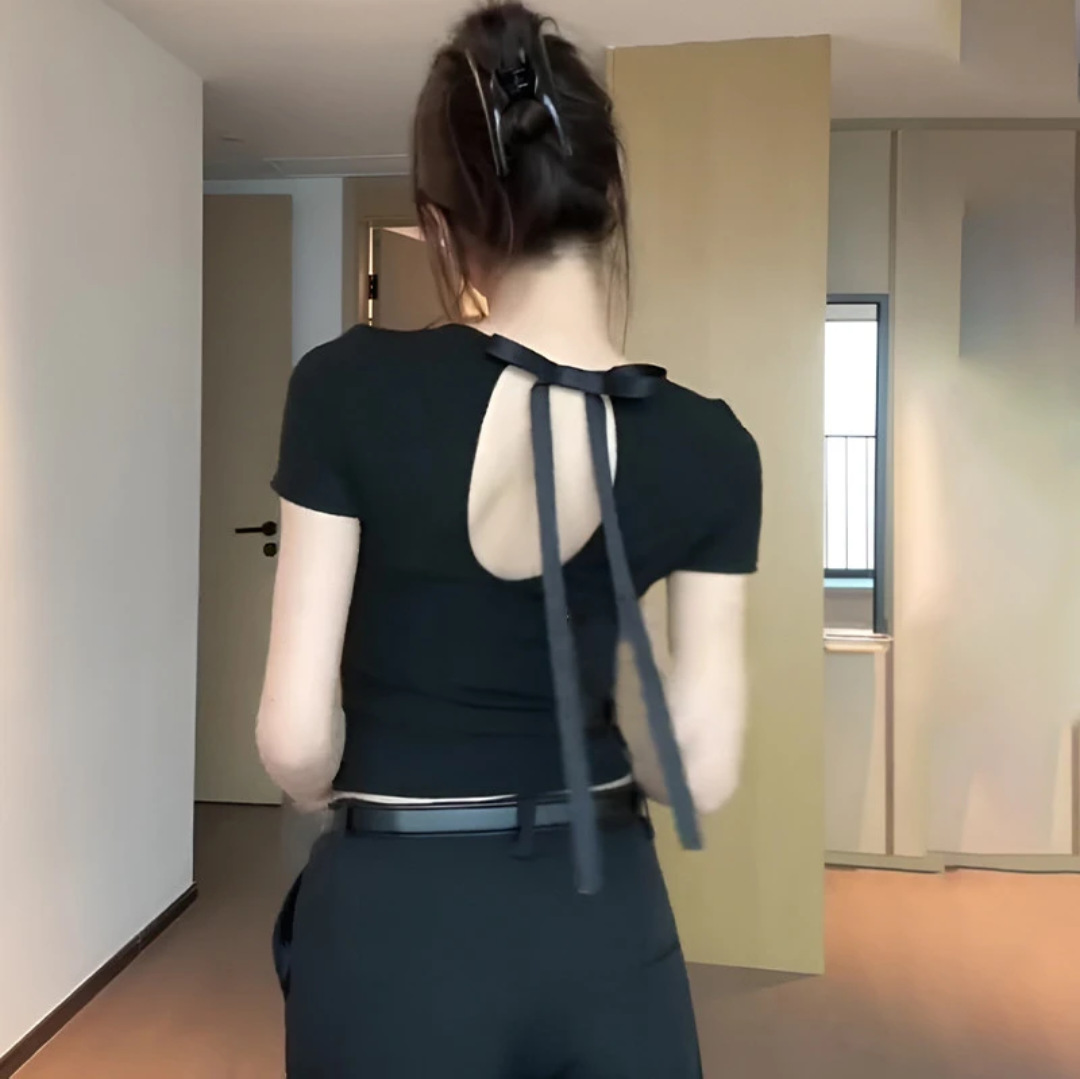 セクシーな純粋な欲望スタイルのリボンバックレススリムショートTシャツ右肩ラウンドネックバックレースホットガール半袖トップ