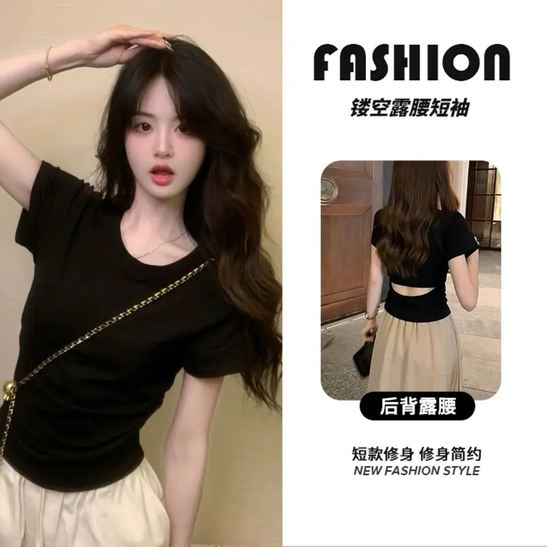 背中の透かし彫りの半袖の女性のtシャツは気をつけてデザイン感が短いです。