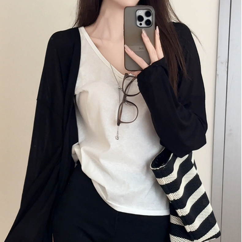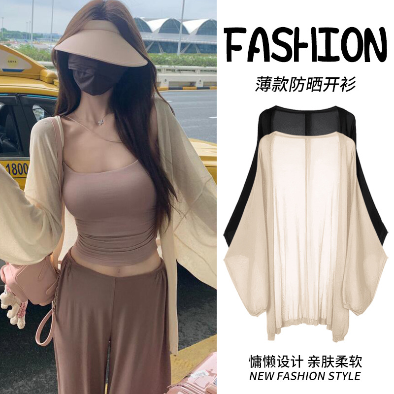 ファッショナブルな日焼け止め長袖レディースニットカーディガン、韓国風ゆったりエアコンカバーアップ、夏用薄手高級気質カーディガン