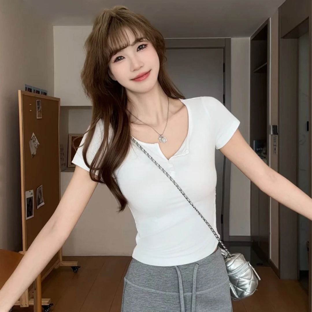 半開襟半袖Tシャツ レディース スリムフィット 細見え エレガント キュート セクシー系 夏トップス ジェリーショートTシャツ