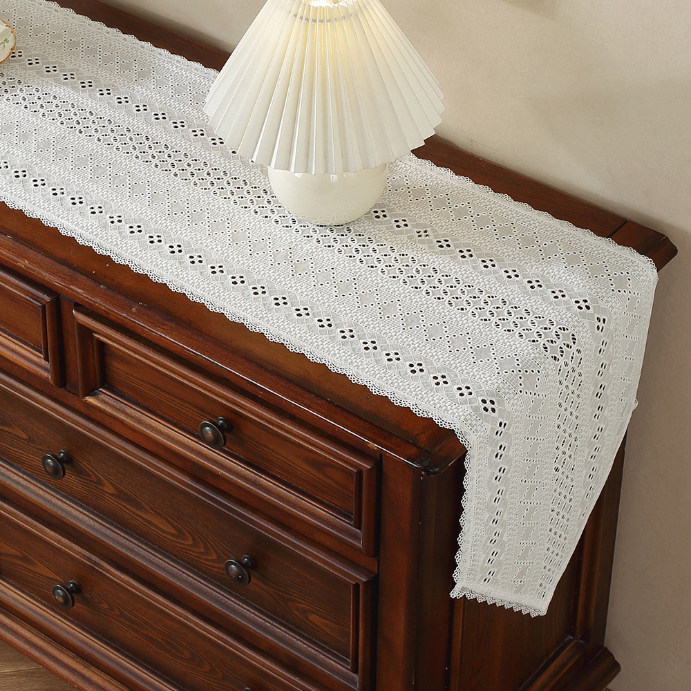 アメリカのレトロなテーブルの旗の白いレースの長いカバーの布のフランス式の5斗の戸棚のテレビの戸棚の装飾のカバーの布の透かし彫りの布の芸