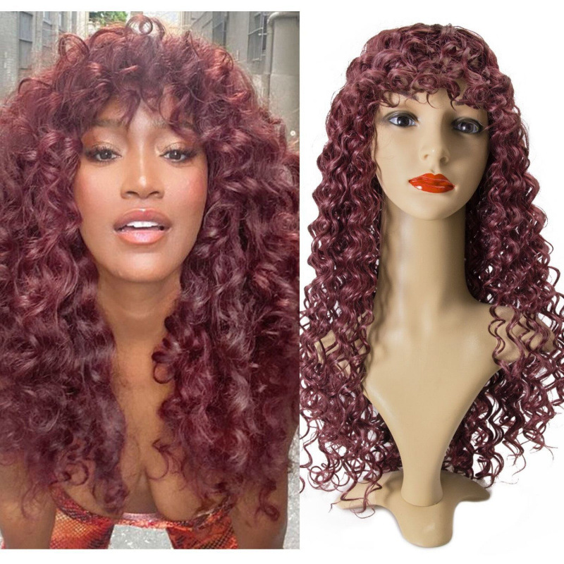 女性用ロング巻き毛ウィッグ、ヨーロッパとアメリカのふわふわ小巻きウールカーリー、ネットセレブ中長ウィッグ