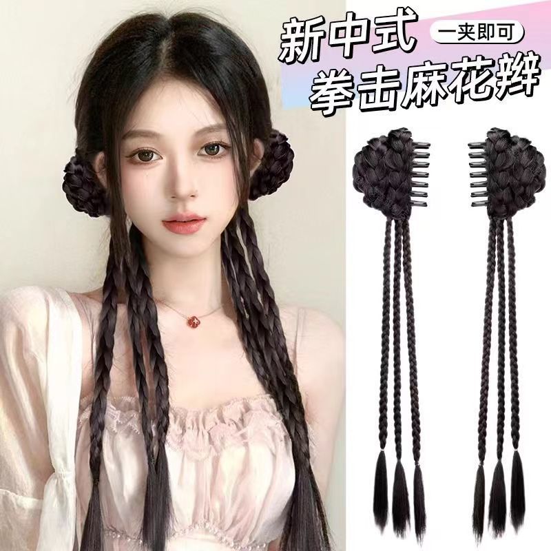 新しい中国風ウィッグ三つ編み女性ダブルツイストボクシング三つ編みウィッグ中国風自然シミュレーション甘くてクールなクリップポニーテールウィッグ