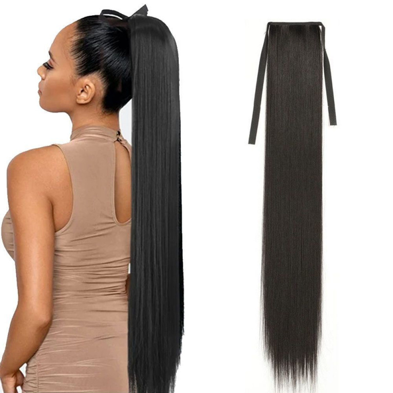 ストラップ付きロングブラックウィッグ、自然なふわふわストレートヘア、パフォーマンスポニーテール、ヨーロッパとアメリカのワンピース女性用ヘアエクステンション