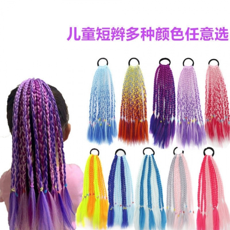 子供用ウィッグ、ドレッドヘアアクセサリー、ポニーテール、ストラップタイプ、カラフルな編み込みヘッドバンド、グラデーションカラー、女の子用ショートスタイル、ステージ用かわいい
