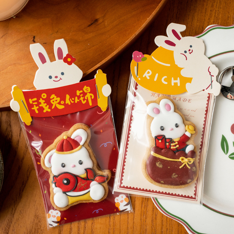 2023ウサギの年の漫画のヘッダーのカードの砂糖クリームのビスケットの袋の砂糖のクッキーのマドレーヌの透明な機械はカードの包装を密封します。