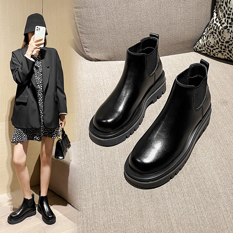 チェルシーのショートブーツの女性2024秋冬の新型の厚い底の本革のタバコの筒の靴の百合の高くなるショートブーツの女性のやせている靴