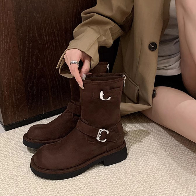 同じ風合いの廃墟風~レトロな厚底バックル付きバイク風マーティンブーツ、女性用スリムブーツ