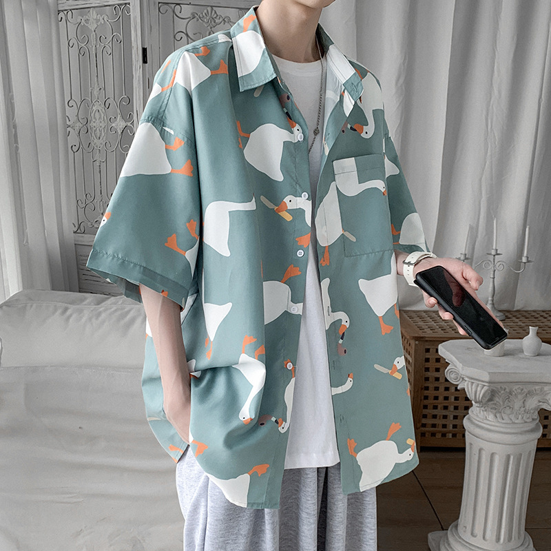 プリント半袖シャツ男insトレンドレトロ香港風夏tシャツ韓国版日本系ゆるいシャツ2024新作