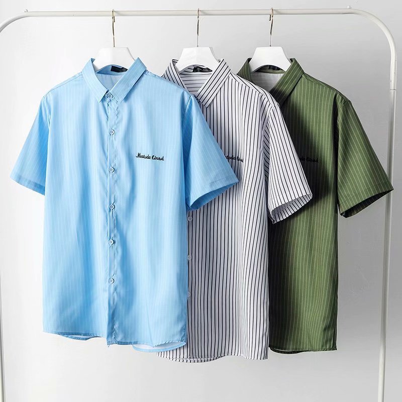 シャツの男性半袖ストライプカジュアル韓国版夏のファッションの男性は氷の糸を合わせてパーマをかけないでかっこいいストライプのシャツのファッションをします。