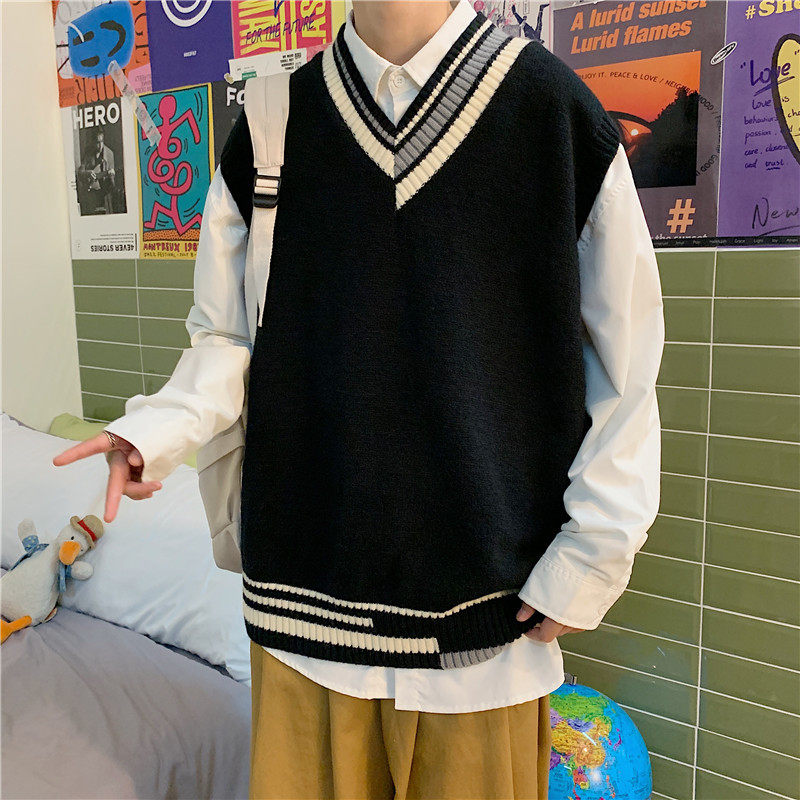 ニットベスト男春秋insトレンド原宿風vネックセーター馬甲韓国版ゆるい外着カンタン上着