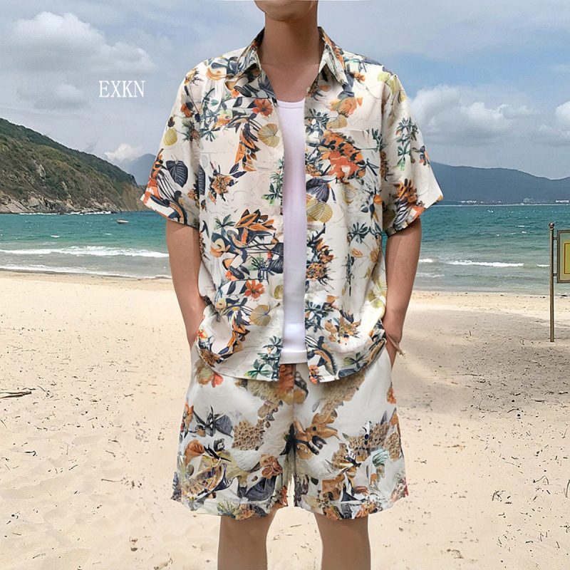 半袖花柄シャツスーツメンズインカジュアルマッチングツーピーススーツボーイズプリントビーチティーンエイジャーシーサイドスーツ