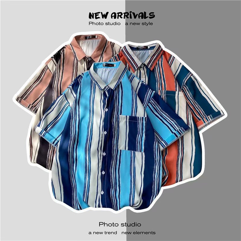 夏ins潮牌レトロストライプゆるいハワイ半袖シャツ男欧米ヒップホップカップルビーチシャツ