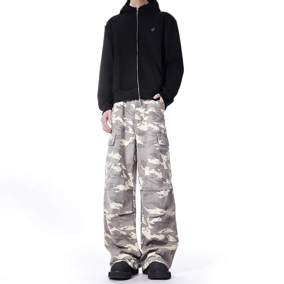アメリカのレトロな迷彩の工装のズボンの男女の春秋の金の広い足の多いポケットの傘の兵のズボンのゆったりしているストレートなカジュアルなズボン
