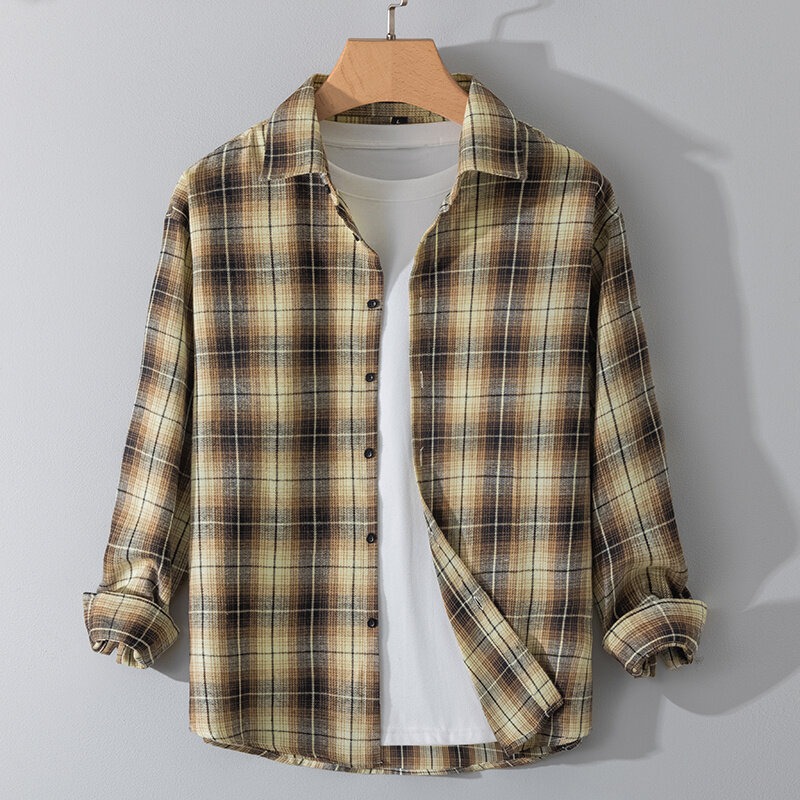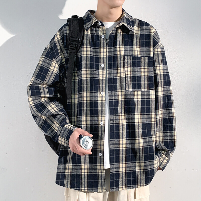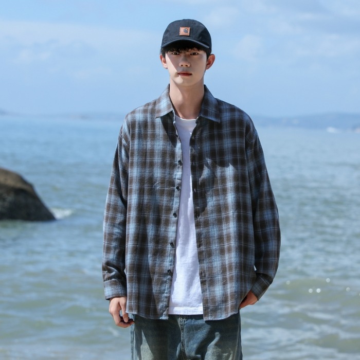 日系レトロ格子シャツ男性長袖春秋新作百合ファッションゆるいカジュアル男性シャツコート