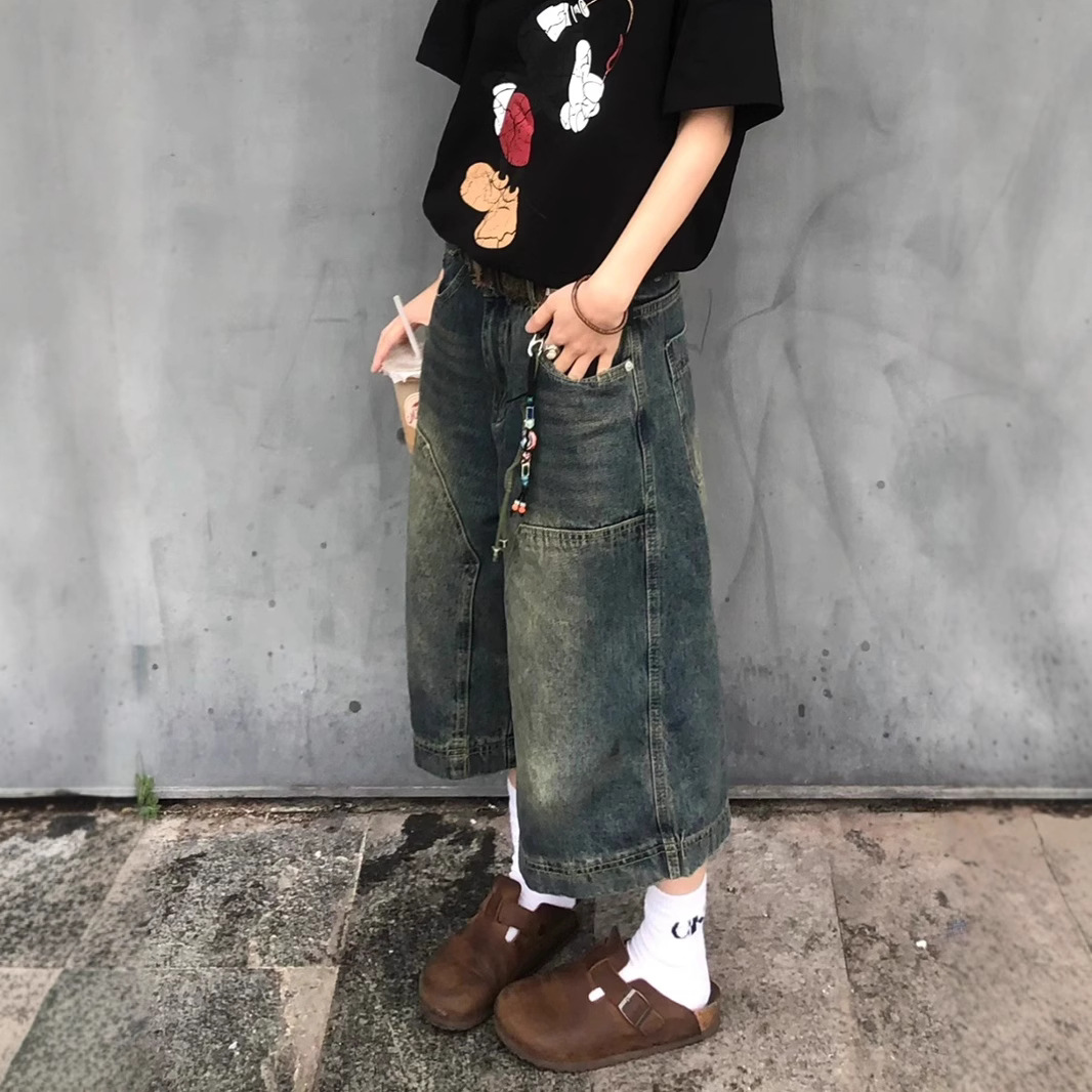 アメリカの街頭の復古は古いデニムの半ズボンをします。