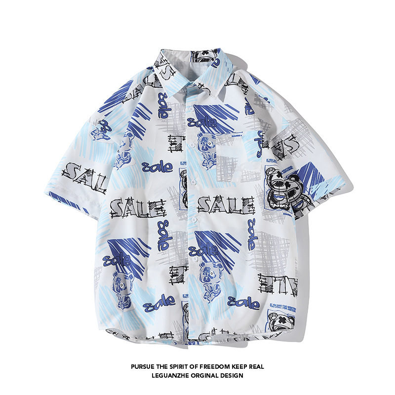 日系趣味落書き熊満印半袖花シャツ男夏ファッションアニメゆるいカジュアルカップルシャツ