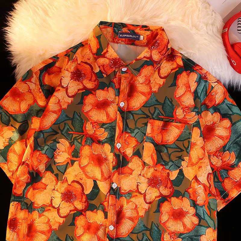 ハワイビーチ花シャツ半袖セットメンズゆるいインスタ香港風レトロなファッション男女シャツパンツ