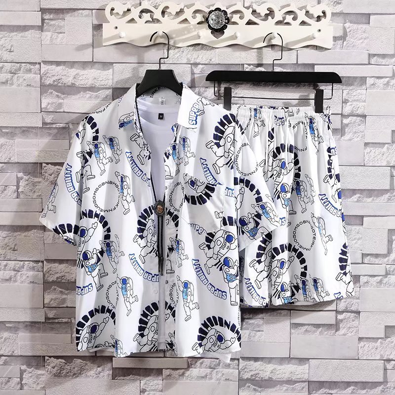 スポーツスーツ男夏半袖2022新品花柄プリントトレンドシャツゆるい半ズボンビーチスーツ潮