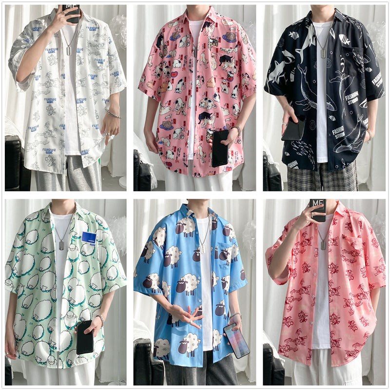 夏の半袖シャツ男小清新森系港風ゆったりとしたカジュアルなモチモチとしたアニメ五分袖寸シャツのファッション