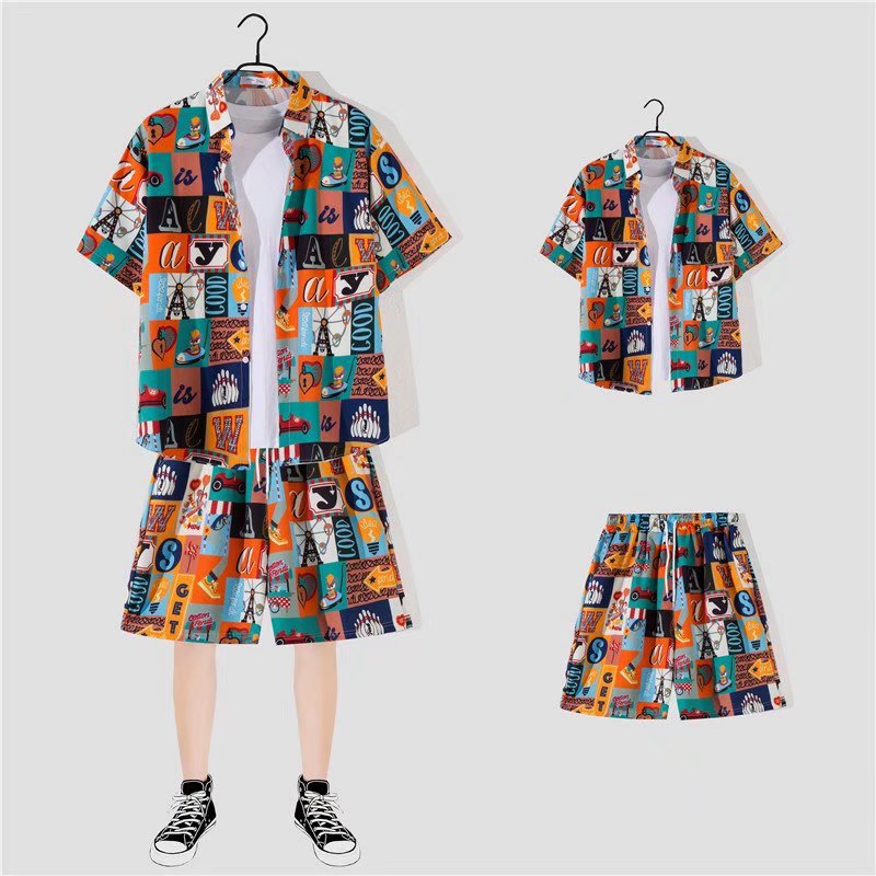 ハワイシャツセット男性夏新作カジュアル2点セットビーチリゾートゆったりカップル半袖半ズボン