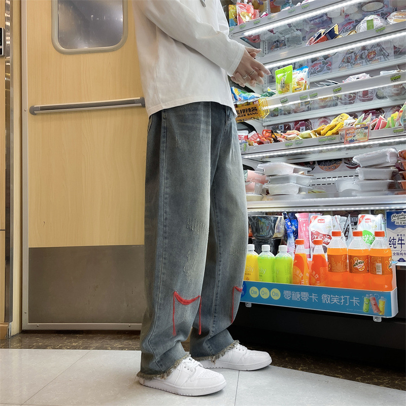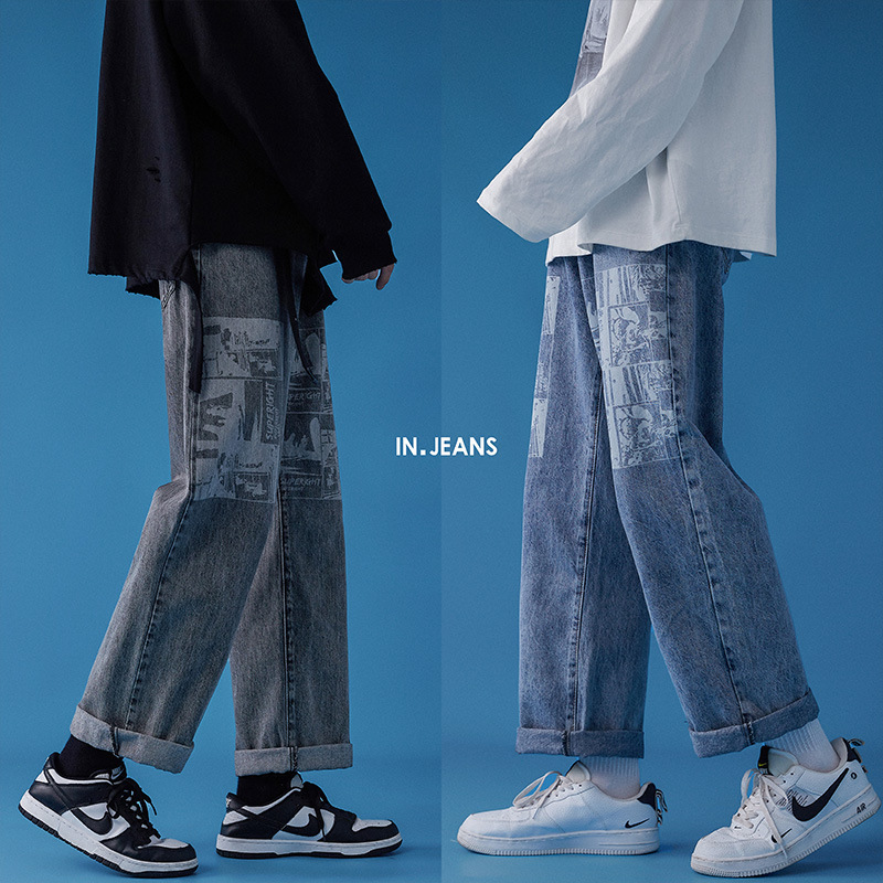 ジーンズ男2022秋冬新作ファッションプリントゆるいズボンストレートアメリカ大サイズレトロカジュアルパンツ