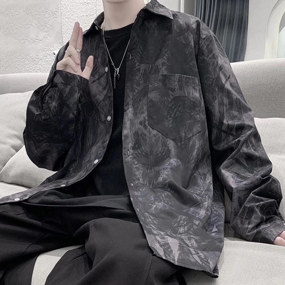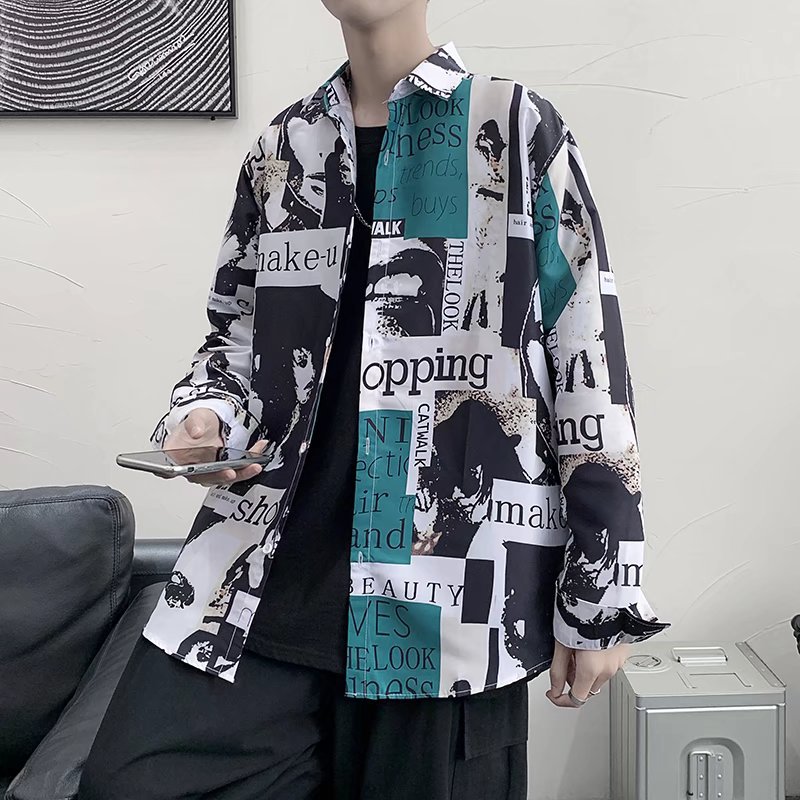 2022春秋新作香港風シャツメンズゆるいトレンドプリントメンズ韓国風ファッションカジュアル長袖シャツ
